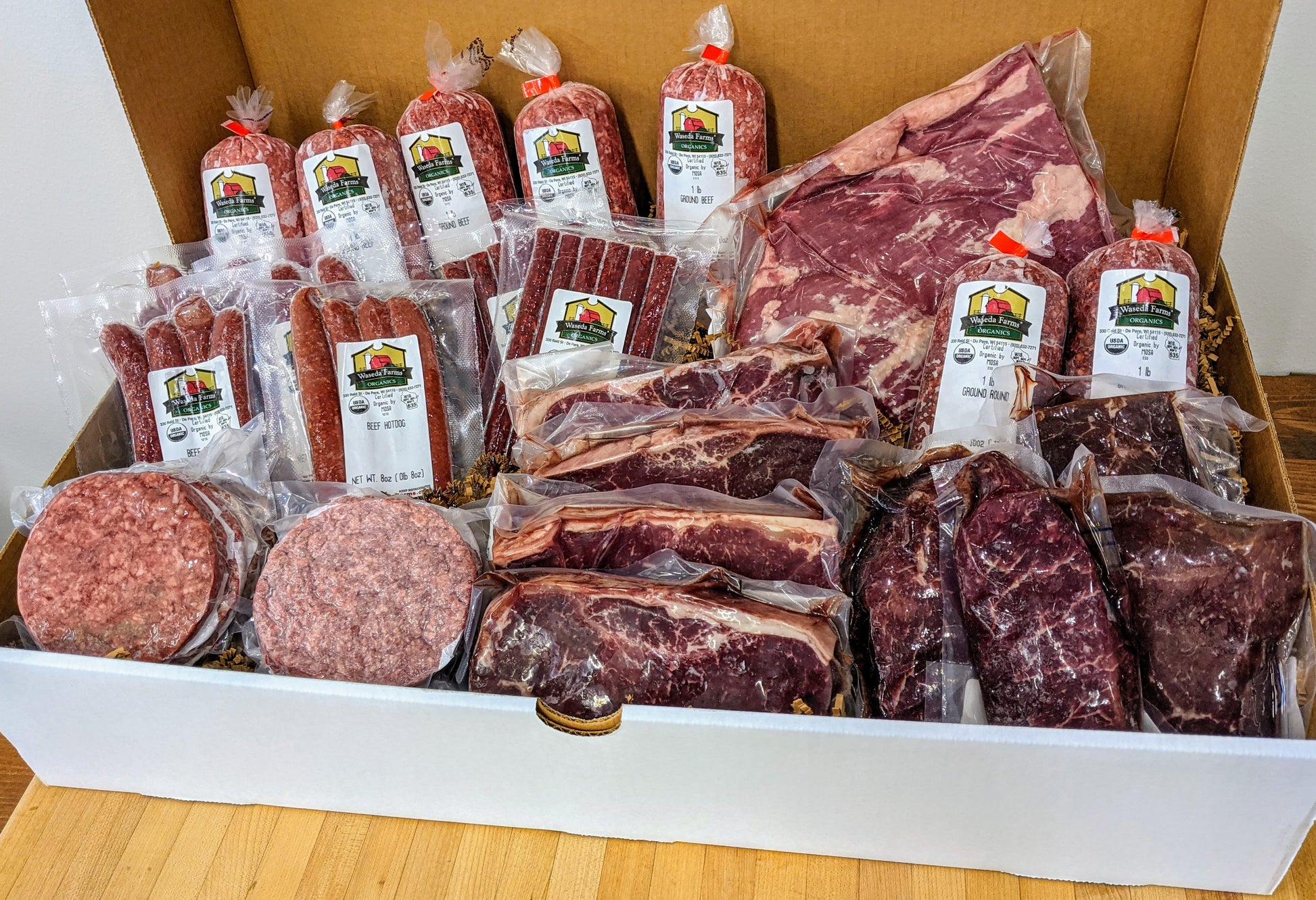 A medium box contains 16 lbs. of Certified Organic, Grass Fed beef from cattle raised organically and humanely on our family farm in Door County, Wisconsin.