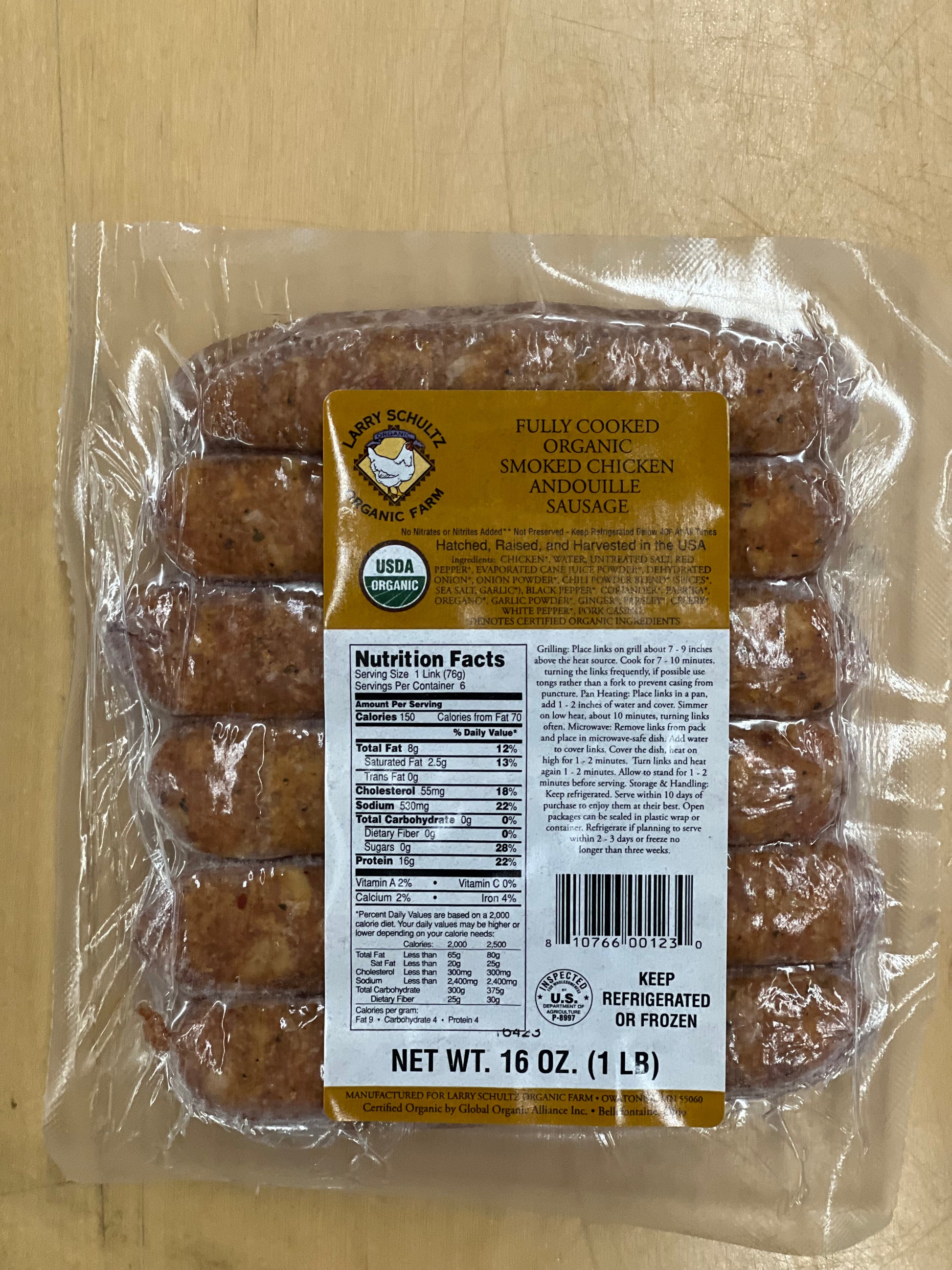 Each package contains 16 oz. of Certified Organic Fully Cooked Andouille chicken sausages.