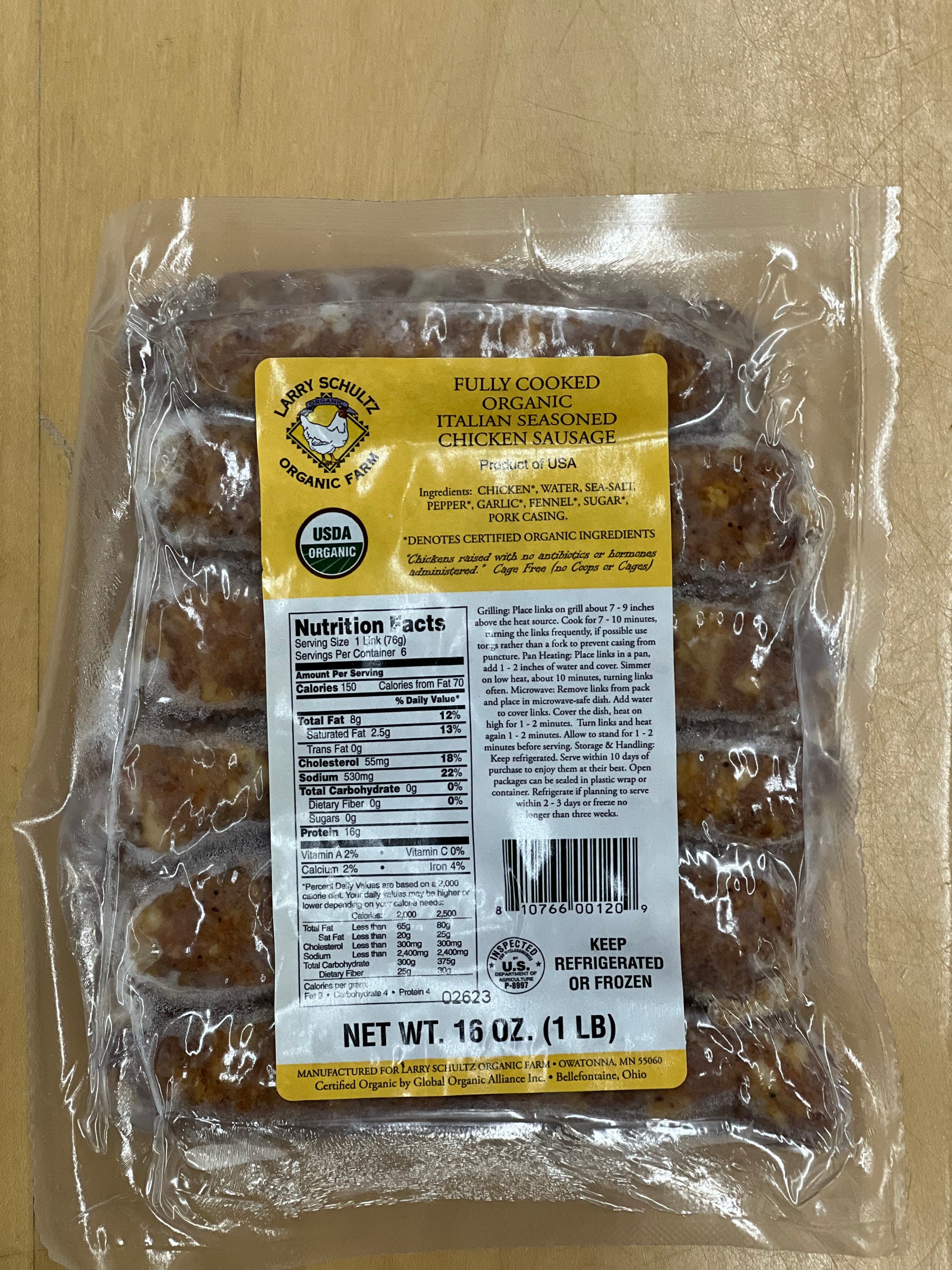 Each package contains 16 oz. of Certified Organic Fully Cooked Italian chicken sausages.