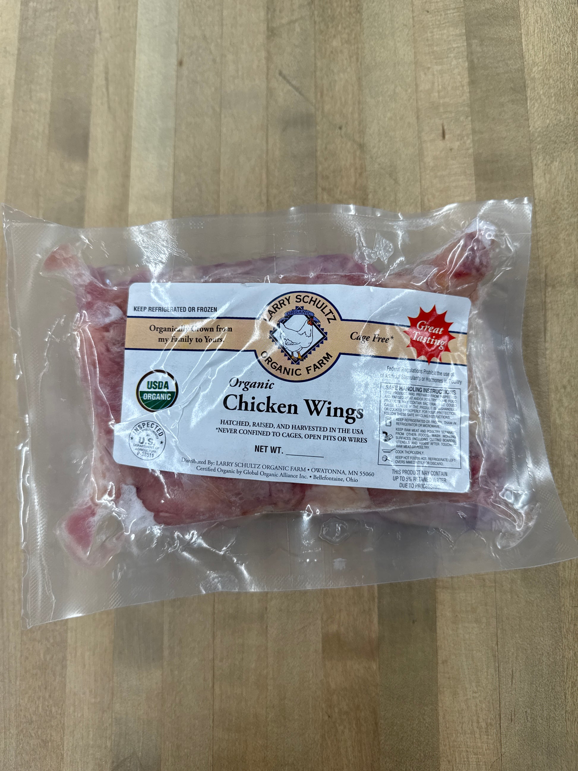 Certified Organic chicken bone in skin on wings. Packed with the nutrition of dense grass and legume pastures and fed a supplemental diet of organic grains.