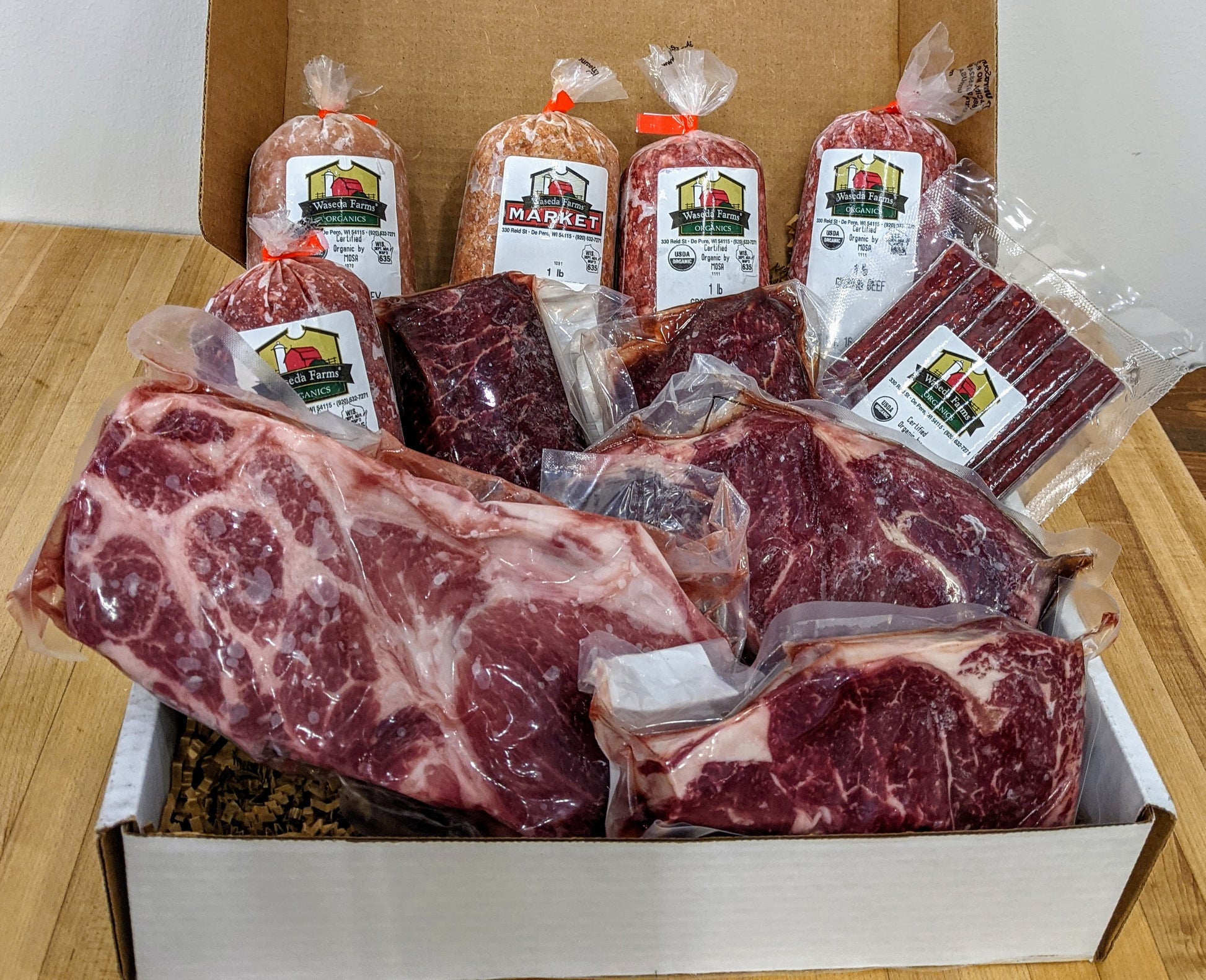 A small box contains 10 lbs. of Certified Organic beef, turkey and chicken, non-GMO raised pork. All raised humanely and sustainably on our family farm in Door County, Wisconsin and partner farms through the Midwest.
