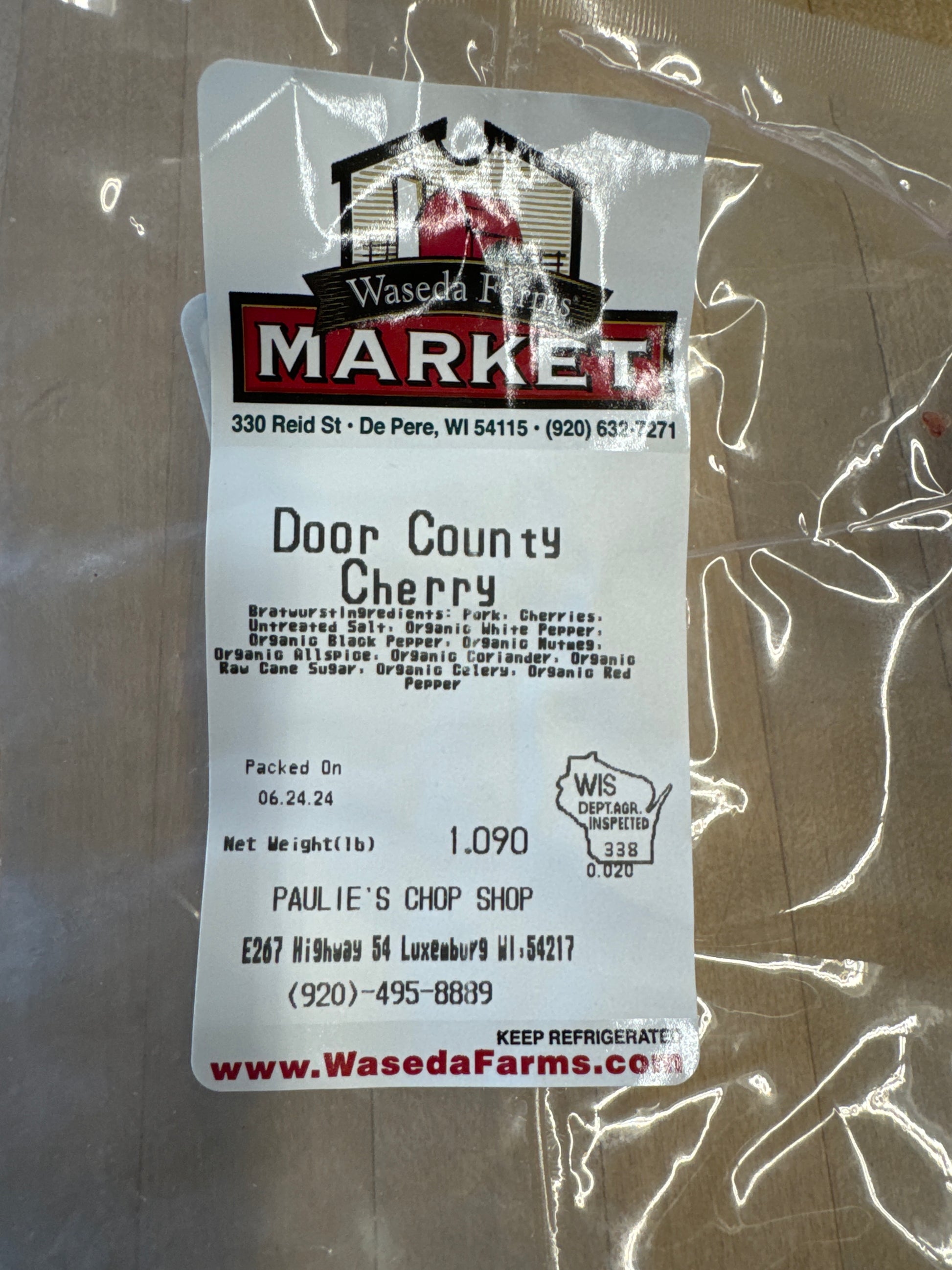 Ingredients: Pork, Cherries, Untreated Salt, Organic White Pepper, Organic Black Pepper, Organic Nutmeg, Organic Allspice, Organic Coriander, Organic Raw Cane Sugar, Organic Celery, Organic Red Pepper, Edible Hog Casing.